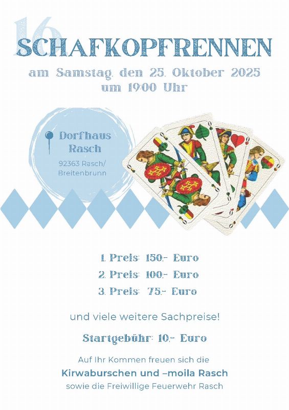 Neben den Preisen für Platz 1 bis 3 gibt es noch weiter Sachpreise. Die TSG Niederfüllbach lädt wieder zum jährlichen Preisschafkopf am 31.10.2025 ein. Einlass ist ab 19.00 Uhr und Beginn des Turniers ist um 19.30 Uhr.