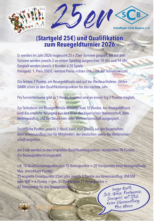 4 Runden a 20 Spiele (Startg.: € 25,00) 1. Preis € 300,00