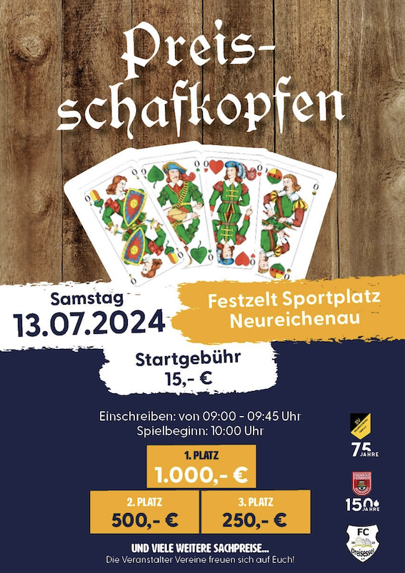Im Falle einer deutschen Beteiligung im EM-Viertelfinale besteht die Möglichkeit zum Public Viewing, der Preisschafkopf beginnt dann nach Abpfiff der Partie.